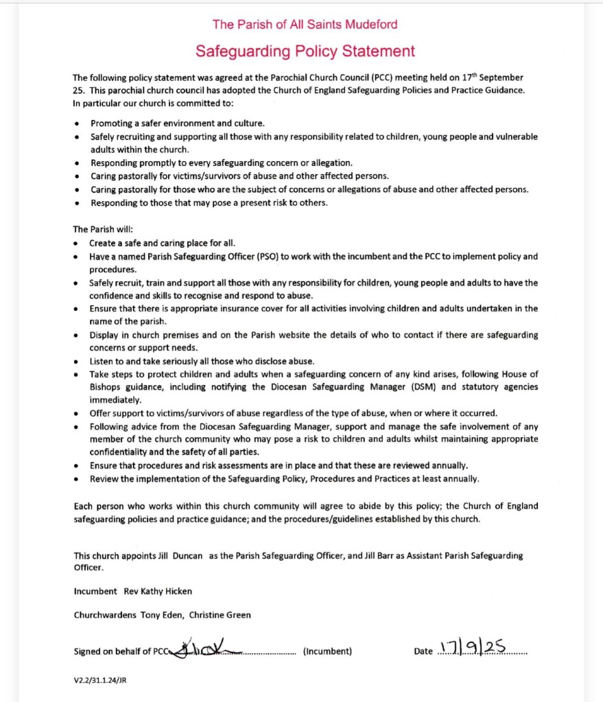 At All Saints Mudeford we work hard to maintain a safe environment for all. We are committed to implementing the House of Bishops’ safeguarding policies and good practice guidance.
