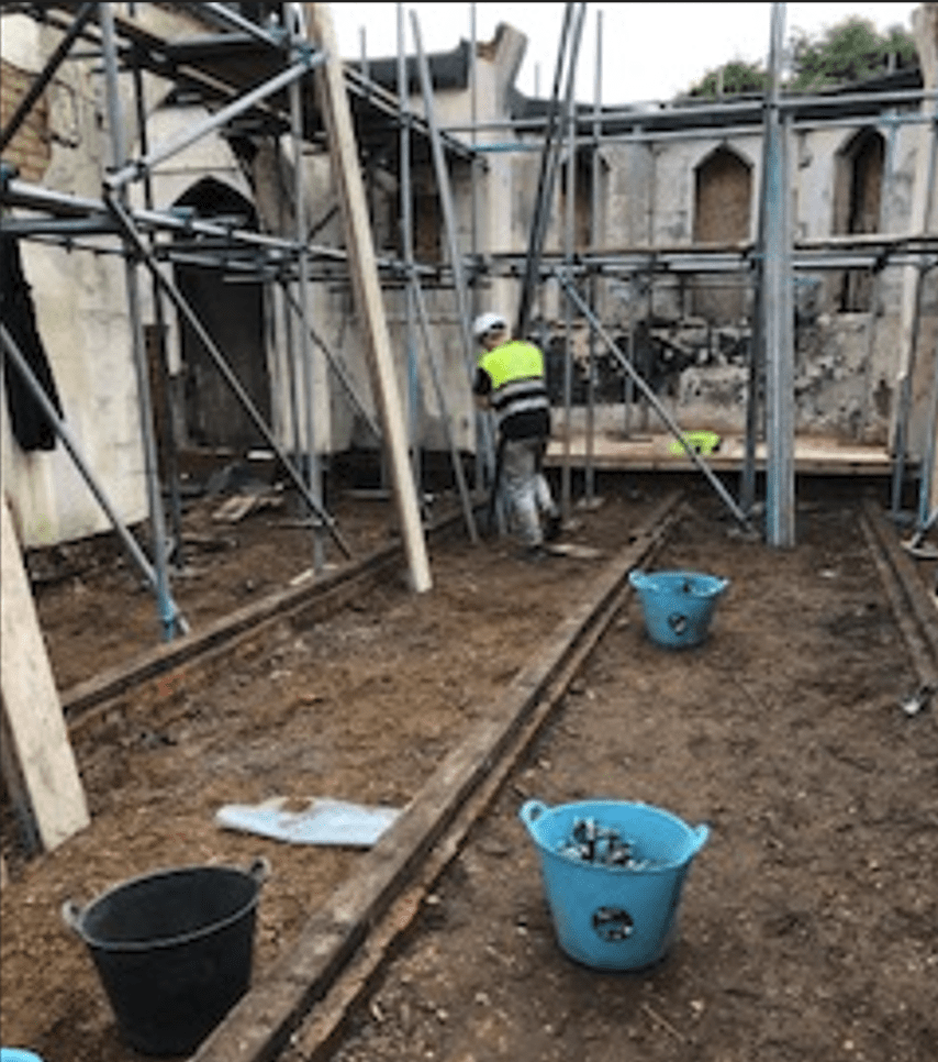 Work started on schedule to rebuild All Saints Church on Monday 8th December. The first task has been to erect scaffolding around the walls of the building to enable a close inspection of the condition of the walls. The floorboards in the church have been removed to assess the condition of the supporting structure. During this work a family of frogs was discovered under the floorboards and they have now been rehoused in the pond which is on site. Corrugated sheeting has been fixed to the scaffolding on the front side of the church to protect the building whilst work is underway. Work will resume on 5th January following the Christmas break.